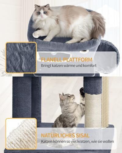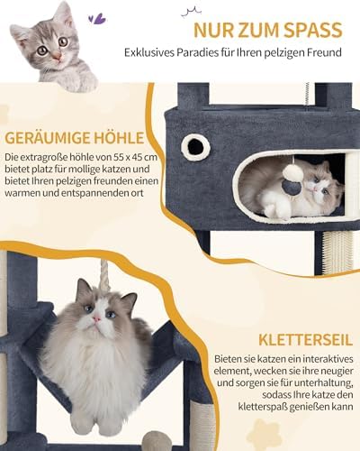 Mehrstöckiger Katzenbaum mit grauen Plattformen, Kratzbäumen und geschlossenen Bereichen. Zur Ausstattung gehören mit Sisal umwickelte Stämme, Plüschflächen und ein baumelndes Spielzeug. Konzipiert für Unterhaltung und Entspannung bei KatzenMehrstöckiger Katzenbaum mit grauen Plattformen, Kratzbäumen und geschlossenen Bereichen. Zur Ausstattung gehören mit Sisal umwickelte Stämme, Plüschflächen und ein baumelndes Spielzeug. Konzipiert für Unterhaltung und Entspannung bei Katzen