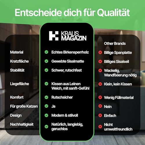 Absolut! Hier ist eine kürzere Version der Bewertung, die auf das Wesentliche konzentriert:Unser neuer Katzenbaum ist ein Traum für unsere Katze und eine Bereicherung für unser Zuhause. Hochwertige Materialien, Top-Verarbeitung. Stabil, sicher und mit großzügiger Liegefläche. Das abnehmbare Kissen ist super praktisch. Ein echter Hingucker! Klare Kaufempfehlung!