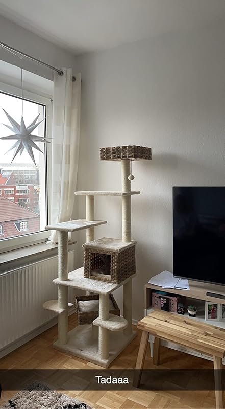 Großer Katzenbaum mit vielen Funktionen zu einem guten Preis.Jedoch lösen sich schon die Faden der Kratzstangen EXTREM leicht ab, sodass eine der unteren Stangen schon über 1/4 des Kratzfadens verloren hat und die darunter liegende Schicht sichtbar ist