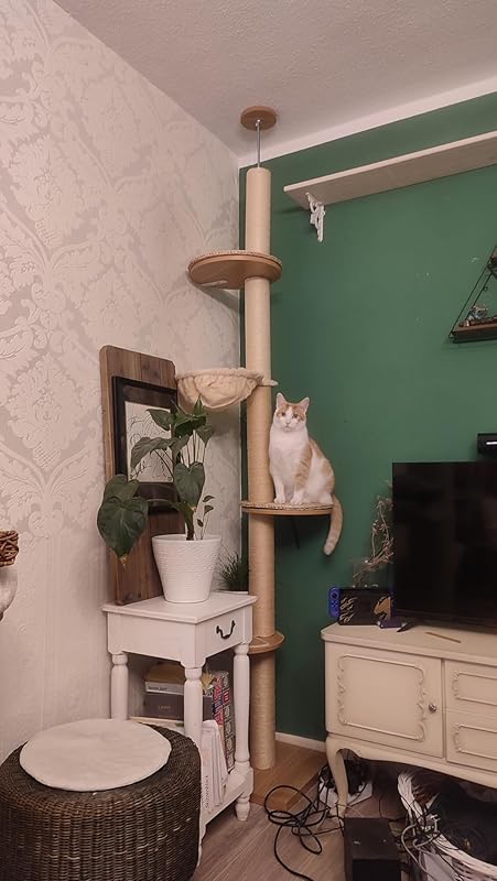 Ich war überrascht, wie schwer das Paket ist, als es hier ankam. Die Sitzplätze sind massiv, was mich sehr beeindruckt. Lediglich die Deckenhalterung überzeugt mich nicht. Ich bekomme die Gewindestange einfach nicht ohne Knick senkrecht zum Kratzbaum, sie hängt minimal schief. Was mich auch stört, ist die Tatsache, das sie sichtbar ist. Ein Stück Stoff zum verstecken der Gewindestange wäre ideal gewesen